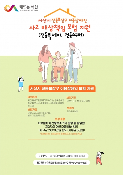 [충청뉴스큐] 충남 서산시는 전동휠체어, 전동스쿠터 등 장애인 전동보장구 관련 안전사고가 늘어남에 따라 이용자들의 불안감을 해소하고 사고로 인한 경제적 부담을 완화하기 위해 ‘전동보장구 이용장애인 사고배상책임 보험’을 이달부터 지원한다고 밝혔다.