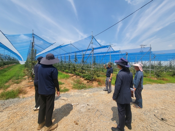 이러한 농가의 노력을 지원하기 위해 농업기술센터는 신기술보급 사업 일환으로 사과 햇빛 차단망 적용 노지 과원 일소피해 저감 시범사업을 추진했다.