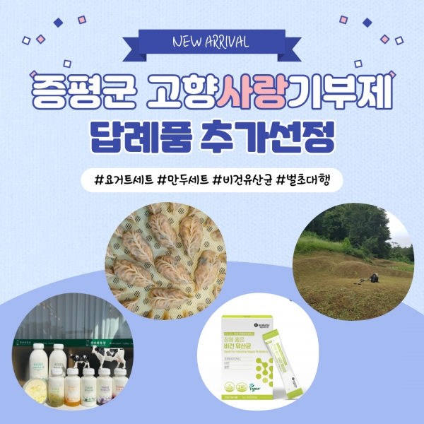 한편 증평군은 답례품으로 수삼, 버섯, 쌀, 약주, 홍삼가공품, 전통붓, 규방공예품 등 30여 개 제품을 제공하고 있으며 이번 신규 답례품인 요거트세트, 만두세트, 비건 유산균, 벌초대행서비스 할인권도 8월부터 본격 제공할 예정이다.