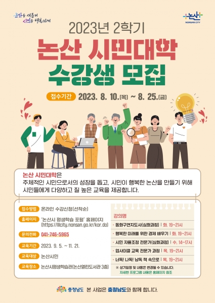 [충청뉴스큐] 논산시가 시민사회의 주체적인 성장을 돕고 남녀노소가 행복한 논산을 만들기 위해 운영하는 ‘논산 시민대학’이 2학기 수강생을 모집한다.