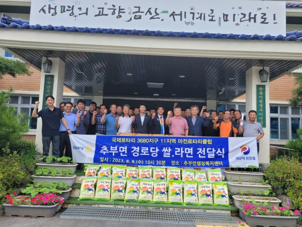 [충청뉴스큐] 국제로타리3680지구 마전로타리클럽은 지난 9일 금산군 추부면 소재 노인여가복지시설 경로당 28개소 및 마을에 어르신들을 위해 사용해달라며 백미 31포와 라면 31박스를 기탁했다.