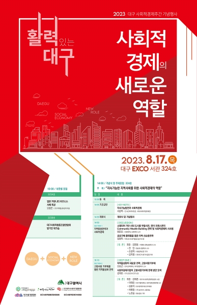 [충청뉴스큐] 이번 행사는 대구가 활력을 되찾고 지속 가능한 발전의 기틀을 다지는 사회적경제의 새로운 역할을 모색해 보고자 ‘우리 모두의 미래를 위한 순환경제, 지속가능한 지역사회를 위한 사회적경제의 역할’을 주제로 준비했다.