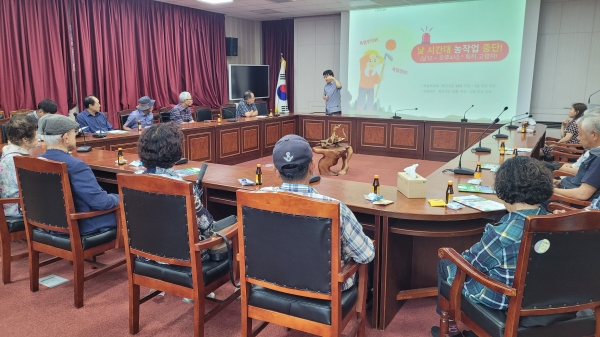 이날 강사로 나선 한경대 박재희 교수는 폭염 대응 농업인 건강관리 농작업 유해 요인과 질병 예방 근골격계 질환 예방 체조를 소개했다.