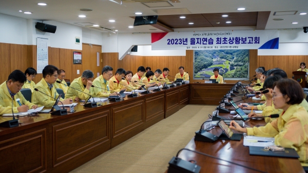 박범인 금산군수는 첫날 오전 8시 30분 군청 상황실에서 최초상황보고회를 주재하고 연습 추진 방향을 논의했다.
