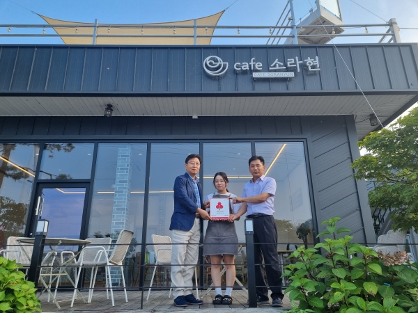 [충청뉴스큐] 황간면 지역사회보장협의체는 21일 카페 소라현을 찾아 ‘착한가게’현판을 전달했다.