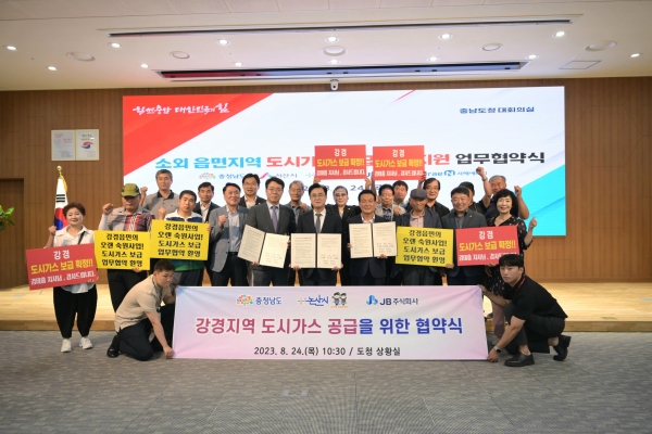 충청남도와 논산시, 서산시, JB㈜, ㈜미래엔서해에너지는 24일 오후 충남도청에서 ‘소외 읍·면 지역 도시가스 공급 특별지원을 위한 협약식’을 갖고 논산시 강경읍, 서산시 운산면 대상 도시가스 배관망 구축에 뜻을 모았다.
