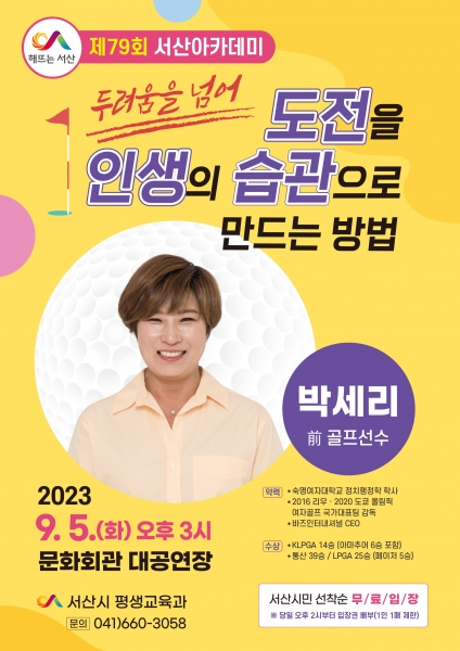 [충청뉴스큐] 충남 서산시가 9월 5일 오후 3시 문화회관 대공연장에서 박세리 전 골프선수를 초청해‘제79회 서산아카데미’를 개최한다고 밝혔다.