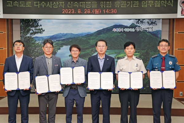 송인헌 군수는 “고속도로 사고 발생 시 다수의 인명 피해가 예상되며 2차적 사고방지를 위해 신속한 대처가 필요하다”며 “이번 협약을 통해 각 기관 간 체계적인 역할 분임을 통해 신속한 대처를 할 수 있도록 최선을 다하겠다”고 밝혔다.