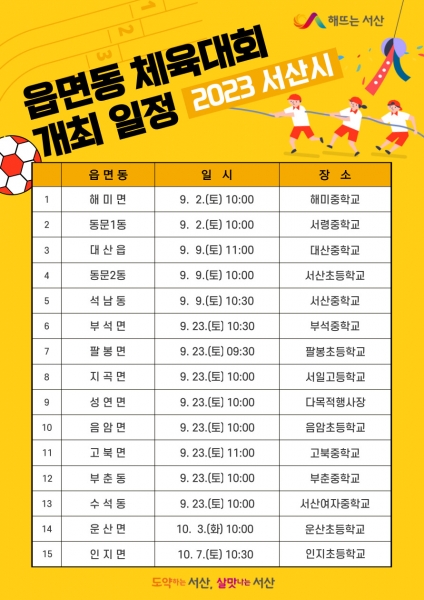 [충청뉴스큐] 충남 서산시가 5년 만에 주민 화합의 장을 마련하고자 ‘2023년 읍면동 체육대회’를 개최한다고 밝혔다.