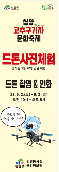 [충청뉴스큐] 청양군이 2023년 청양고추·구기자 문화축제장을 찾아오는 관광객과 군민들에게 드론을 활용한 사진 촬영과 인화를 통한 추억만들기를 선물한다.