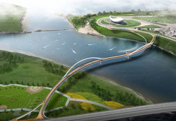 디아크 문화관광 활성화 사업은 길이 435미터, 폭 4~6미터의 랜드마크 관광보행교에 카페, 전망대, 낙하분수 등을 설치하고 주변에 다목적 광장, 피크닉장, 디아크 비치, 야생화 정원 등 배후 시설을 설치해 디아크 일대를 생태·문화·관광의 거점으로 만들고자 하는 사업이며이 사업의 핵심인 랜드마크 교량의 디자인은 대한민국 최고의 설계업체들로부터 제안을 받아 심사를 통해 선정된 안으로 디아크의 모티브가 된 물수제비와 두루미의 비상을 형상화한 아치교 형태로 디아크 주변 자연환경과의 조화로움에 주안점을 두었다.