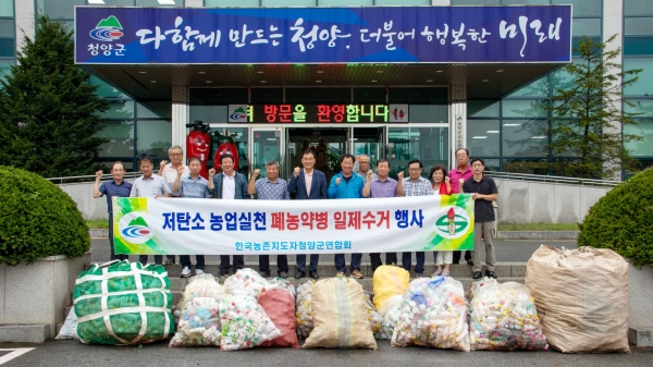 이날 농촌지도자회 임원진 15명은 읍면별로 수거한 폐농약병 1톤을 환경사업소에 전달하는 한편 저탄소 농업 실천 운동으로 친환경 농자재 제조 벼 대체 메탄 저감 작물 재배 전통 농경문화 보존 의지를 다졌다.