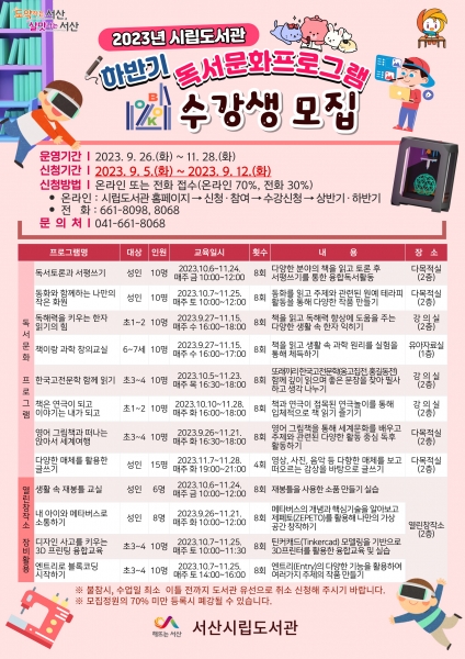 신청은 서산시립도서관 누리집이나 전화로 하면 된다.