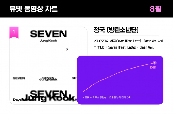글로벌 팬덤 플랫폼 뮤빗에 따르면 정국의 ‘Seven – Clean Ver.’의 뮤직비디오가 7월에 이어 8월에도 최다 조회 수를 기록하며 8월 동영상 차트 1위를 차지했다.