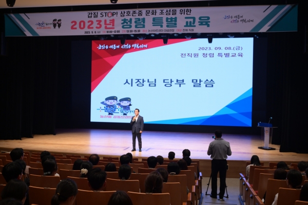 [충청뉴스큐] 논산시가 공직사회 내 ‘갑질’을 예방하고 직원 간 상호 존중하는 문화를 조성하고자 청렴 특별교육을 실시했다.