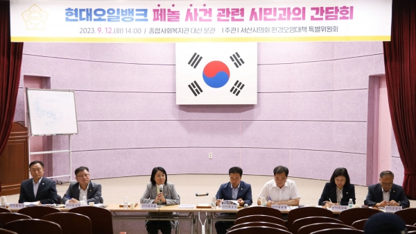 [충청뉴스큐] 서산시의회 칠전리 부숙토 및 현대오일뱅크 페놀 관련 환경오염대책 특별위원회는 지난 12일 종합사회복지관 대산분관 3층 공연장에서 이장단 및 어촌계, 지역주민, 환경단체 등이 참석한 가운데 현대오일뱅크 페놀 배출로 인한 환경오염 등 피해의 향후 대응방안을 논의하는 간담회를 진행했다.