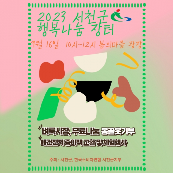 [충청뉴스큐] 서천군이 오는 16일 서천 봄의마을 광장에서 청소년의 환경보호와 자원순환에 대한 인식을 높이고자 지역단체와 주민이 함께하는 ‘2023년 행복 나눔장터’를 개최한다.