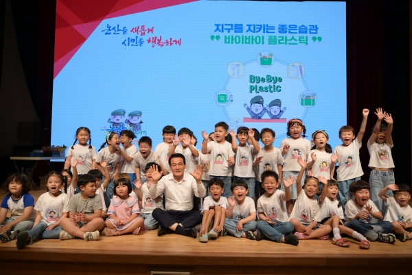 ‘어린이와 함께하는 환경 그리기 한마당’ 시상식을 위해 논산아트센터를 찾은 어린이집의 원생들이 백 시장의 챌린지 이미지 촬영에 동참해 미래세대를 위한 환경보호라는 메시지의 의미를 한층 높였다.