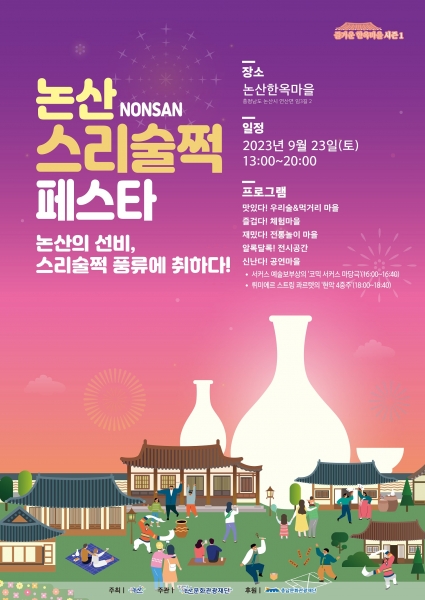 [충청뉴스큐] 논산문화관광재단은 오는 23일 논산한옥마을에서 ‘즐거운 한옥마을 시즌1-논산 스리술쩍 페스타’를 개최한다고 밝혔다.