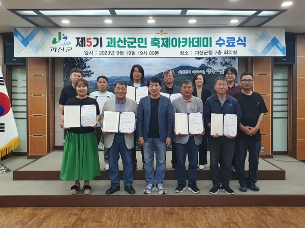 정미훈 문화체육관광과장은 “바쁘신 일정에도 불구하고 교육을 마친 수료생들에게 진심으로 축하를 드리고 축제아카데미 수업을 통해 군민들의 축제에 대한 열정을 확인하는 계기가 됐다”며 “괴산군 축제의 지속적인 성장과 발전할 수 있도록 많은 관심과 조언 부탁드린다”고 말했다.
