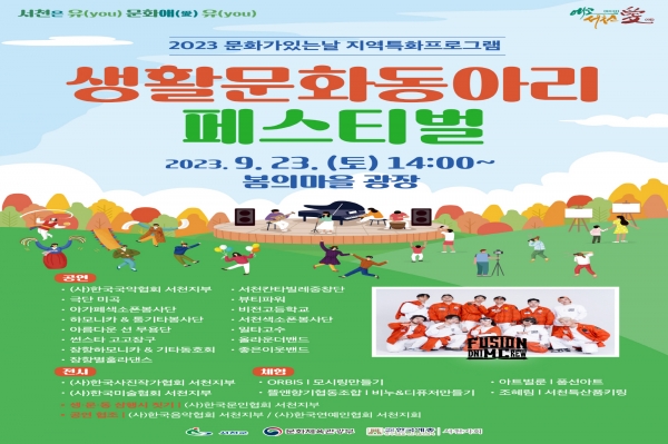 [충청뉴스큐] 서천군과 ㈔한국예총 서천지회가 오는 23일 봄의마을 광장에서 문화가 있는 날 프로그램의 일환으로 관내 공연·전시·체험 문화예술단체가 참여하는‘생활문화동아리 페스티벌’을 개최한다.