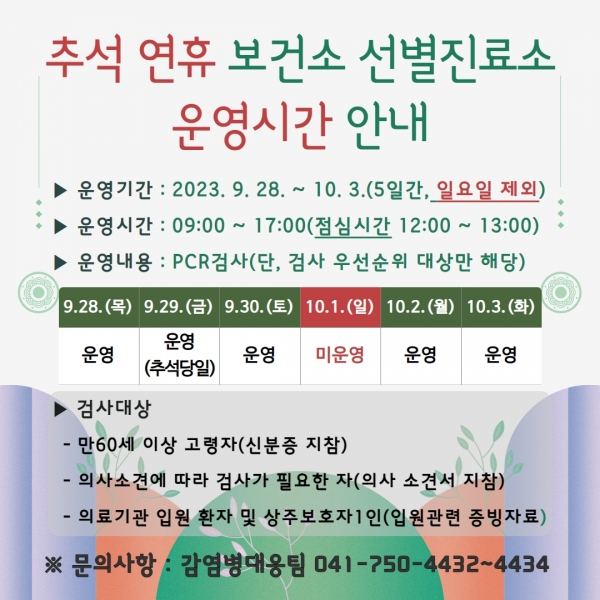 보건소는 코로나19 전파 방지 및 입원을 위한 PCR 검사를 요하는 군민을 위해 10월 1일을 제외한 9월 28일부터 10월 3일까지 선별진료소를 운영할 계획이다.