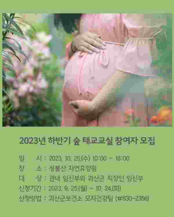 [충청뉴스큐] 충북 괴산군보건소는 오는 10월 25일 성불산 자연휴양림에서 괴산군에 거주하는 임신부 및 관내 직장인 임신부를 대상으로 ‘숲 태교 교실’을 운영한다.