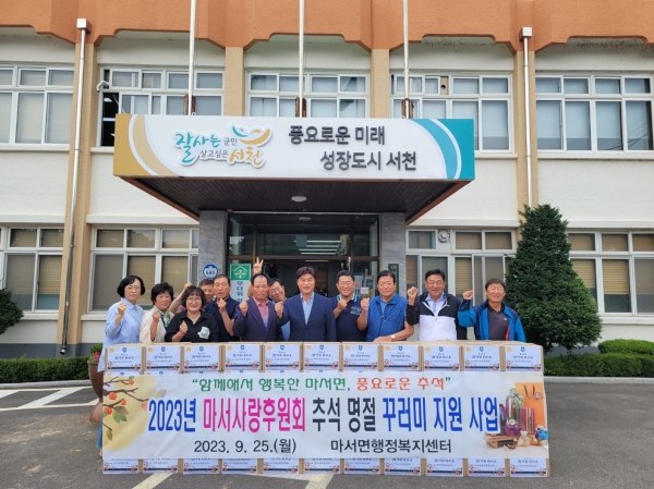 [충청뉴스큐] 서천군 마서사랑후원회가 지난 25일 추석을 맞아 관내 어려운 이웃 100가구에 ‘행복가득 꾸러미’를 전달해 주위를 훈훈하게 만들었다.
