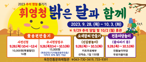 [충청뉴스큐] 옥천전통문화체험관에서는 추석 연휴가 시작하는 28일부터 10월 3일까지 추석 맞이 행사를 진행한다.