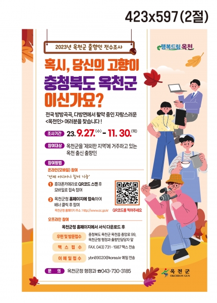 [충청뉴스큐] 옥천군은 명절을 앞둔 오늘 9월 27일부터 11월 30일까지 전국 팔도, 각계각층에서 활약 중인 옥천군 출신 출향인 집중 전수조사를 실시한다고 밝혔다.