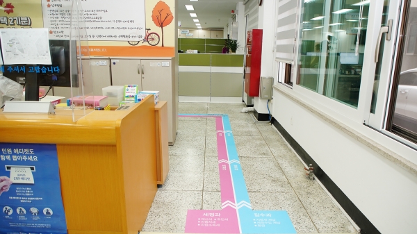 시는 세정과와 징수과를 분홍색과 파란색으로 구분해 바닥 유도선을 설치하고 자주 방문하는 재산세, 자동차세, 지방세 체납 등 업무별 위치를 표시해 시민들이 원하는 업무 창구로 바로 찾아갈 수 있도록 유도선을 조성했다.