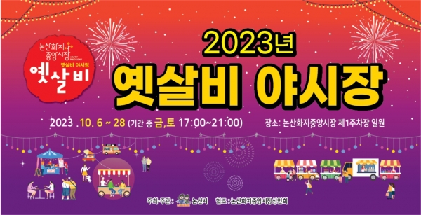논산시는 6일 오후 5시 화지중앙시장 제1주차장에서 ‘2023 옛살비 야시장’ 개막 행사를 열고 6일부터 28일까지 매주 금·토요일 저녁에 야시장을 운영한다고 밝혔다.