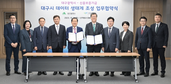 [충청뉴스큐] 대구광역시는 5일 오후 3시 산격청사 대회의실에서 홍준표 대구광역시장과 국내 최대 중소기업 정책금융기관인 신용보증기금의 최원목 이사장이 참여한 가운데 ‘대구시 데이터 생태계 조성’을 위한 업무협약을 체결했다.
