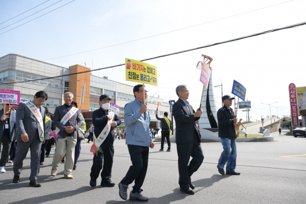 강경읍 이장단협의회, 주민자치회, 부녀회, 번영회 등 지역 내 주민 모임은 물론 소비자교육중앙회 논산시지회, 강경맛깔젓협동조합 등 다양한 단체 회원 100여명은 6일 오전 강경읍사무소로 모인 뒤 질서정연한 가두 캠페인에 나섰다.