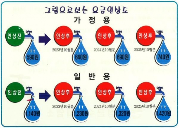 군은 그동안 정부의 공공요금 인상억제 정책과 물가안정을 위해 상수도 요금을 2017년부터 6년 동안 동결해 왔으나, 그동안 원가 대비 낮은 요금 현실화율로 만성 적자, 적기투자 미흡 등 경영여건 악화로 요금인상이 불가피해 연차적으로 3회에 걸쳐 요금인상을 시행 추진하기로 했다.