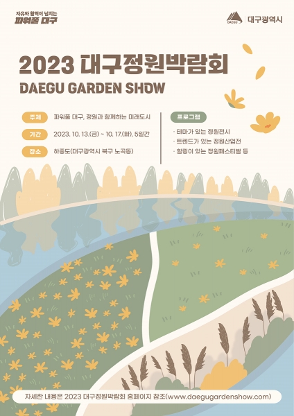 [충청뉴스큐] 대구광역시는 금호강의 가을 정취를 물씬 느낄 수 있는 ‘2023 대구정원박람회’를 오는 10월 13일부터 17일까지 5일간, 대구 북구 노곡동 하중도에서 개최한다.