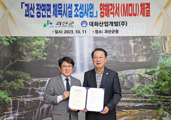지난 11일 괴산군청 군수집무실에서 송인헌 군수와 이용 대화산업개발㈜ 대표이사 등 양측 관계자들이 참석한 가운데 체육시설 조성사업의 성공적인 추진을 위한 업무협약을 체결했다.