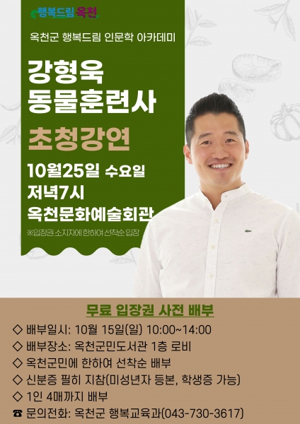 [충청뉴스큐] 충북 옥천군이 오늘 25일 저녁 7시 옥천문화예술회관에서 반려견 전문가로 활동하고 있는 ‘개통령’ 강형욱 보듬컴퍼니 대표를 초청해 ‘반려동물과 더불어 사는 법’을 주제로 강연을 개최한다.