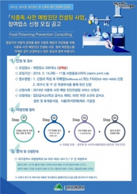 김연신 대구시 위생정책과장은 “현재 식중독 원인 조사반으로 활동하고 있는 담당 위생공무원이 진행하는 컨설팅인 만큼 현장 경험을 살려 양질의 서비스로 참여업소에 실질적인 도움이 될 수 있을 것이다.” 며 “참여와 교육 위주의 컨설팅으로 구성되어 있으니 많은 영업자가 부담없이 신청하길 바란다.”고 당부했다.