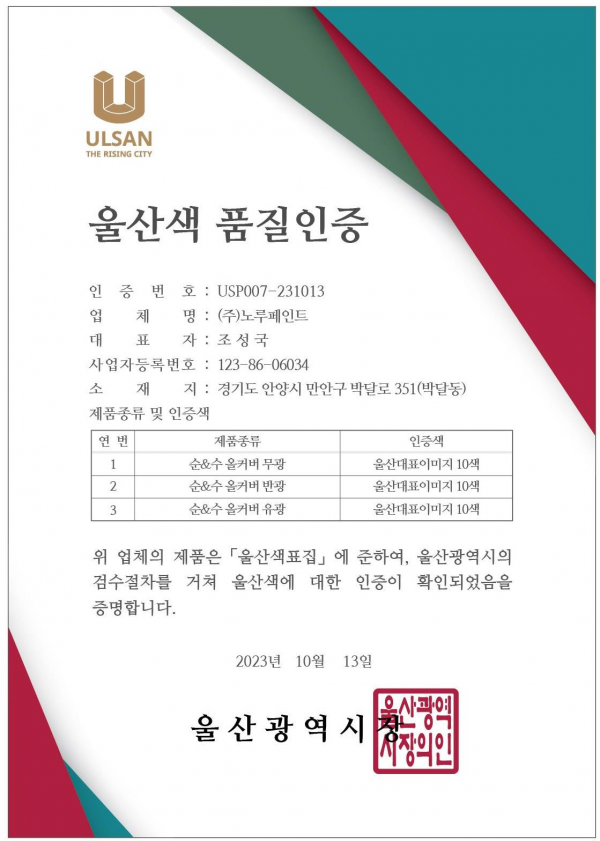 [충청뉴스큐] 울산시는 울산색 품질인증을 위해 ㈜노루페인트가 신청한 4개 품목, 40개 제품에 대해 한국색채디자인개발원의 검수를 거쳐 ‘울산색 품질 인증서’를 교부했다고 밝혔다.