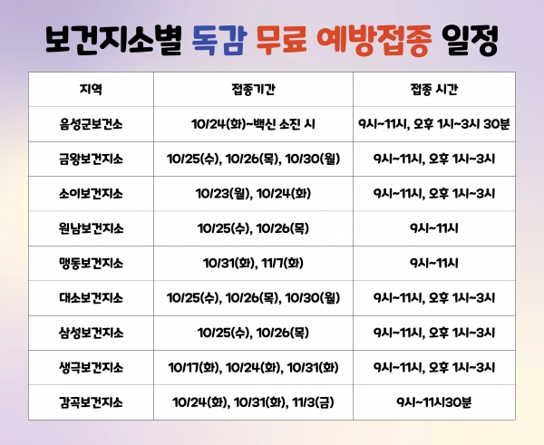 [충청뉴스큐] 음성군은 독감 유행을 대비하고 취약계층의 접종 비용 부담 완화를 위해 독감 무료 예방접종을 실시한다고 20일 밝혔다.