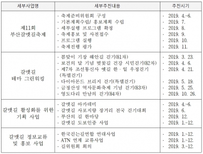 갈맷길 활성화를 위한 기획사업으로는 ,갈맷길 아카데미, ,갈맷길 사포지향 장거리 전국 걷기대회, ,부산의 길 한마당 등을 진행할 예정이다.