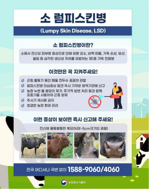 럼피스킨병은 모기 등 흡혈 곤충에 의해 전파되는 소에서만 발생하는 비 인수공통질병으로 사람에게 전파되지 않는다.