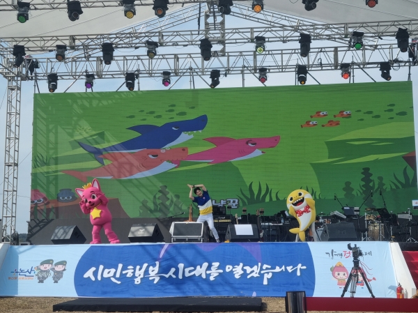 지난 20일부터 22일까지 강경젓갈축제 본무대에서 열린 이번 공연은 어른들만의 축제에서 벗어나 전 세계적으로 사랑받는 핑크퐁, 아기상어, 튼튼쌤이 출연해 어이들이 사랑하는 다양한 노래와 율동을 선보이는 공연이었다.