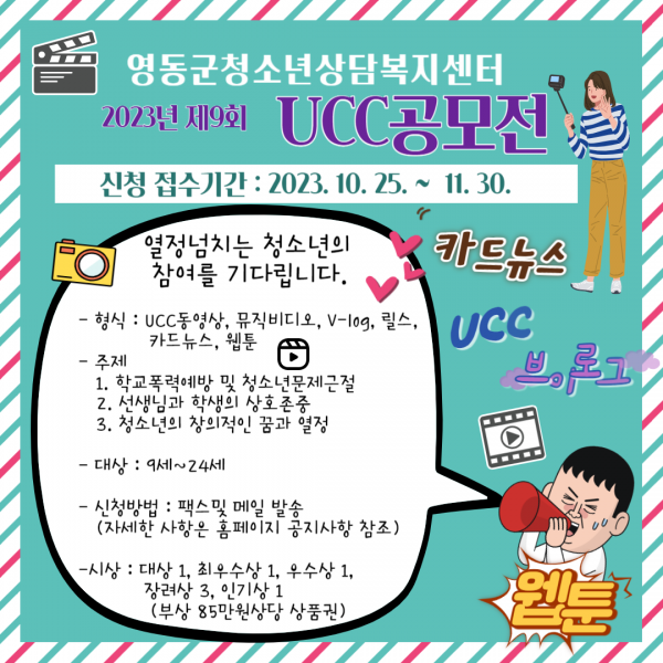 [충청뉴스큐] 충북 영동군 영동군청소년상담복지센터는 ‘2023년 제9회 청소년문제예방 UCC 공모전’을 개최한다고 26일 밝혔다.