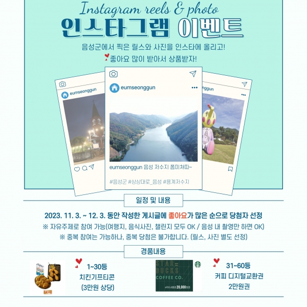 군 관계자는 “이번 릴스·사진 응모하기 이벤트를 통해 MZ세대가 주로 이용하는 인스타그램 내 소통 강화와 SNS 알고리즘을 활용한 효과적인 음성군 홍보에 최선을 다하겠다”며 “여러분의 많은 관심과 참여를 바란다”고 말했다.