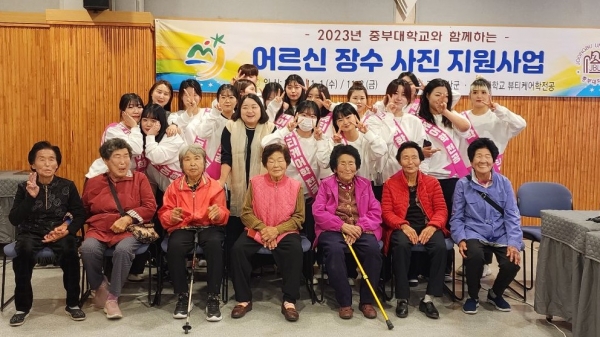 사진 촬영은 중부대학교 학생 및 관계자 26명이 참여한 가운데 진행됐으며 어르신 50여명을 위한 헤어·메이크업, 네일케어, 손마사지, 간식제공 등도 함께 진행됐다.