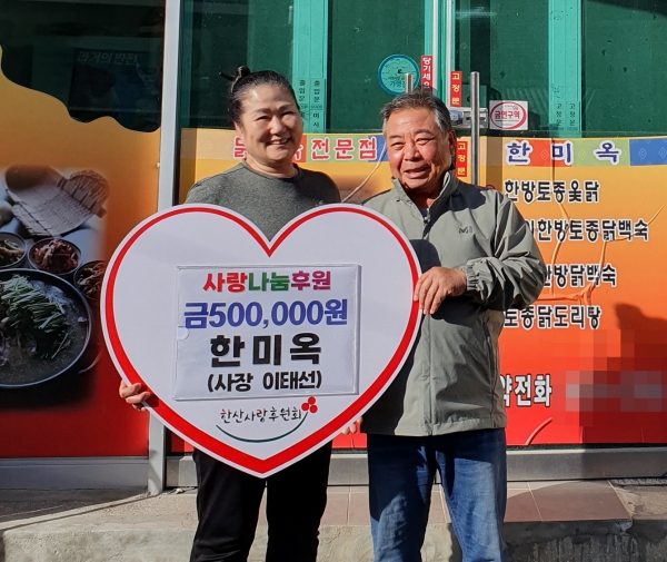 [충청뉴스큐] 서천군 한산면 소재 음식점 한미옥의 이태선 사장이 지난 6일 어려운 이웃을 돕고자 한산사랑후원회에 50만원을 기탁했다.