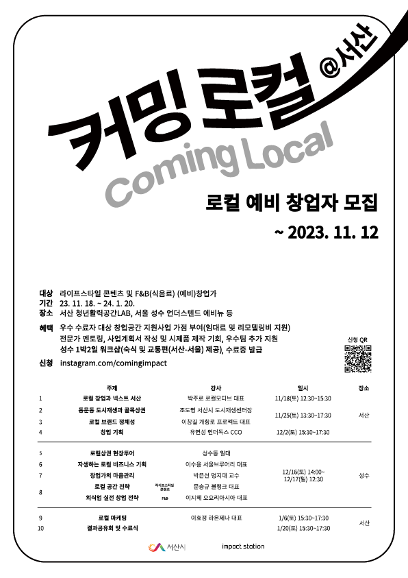 [충청뉴스큐] 충남 서산시는 창업인 지원 프로그램인 ‘커밍로컬@서산’의 예비 창업자를 이번 달 12일까지 모집한다고 밝혔다.