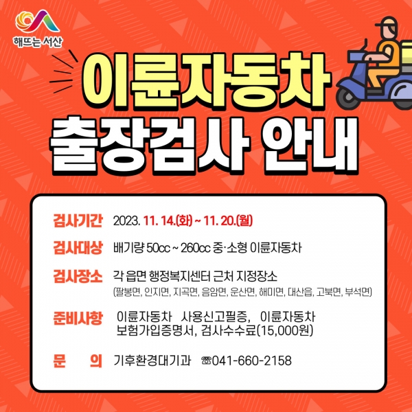 [충청뉴스큐] 충남 서산시가 14일부터 20일까지 한국교통안전공단과 함께 관내 읍면지역에서 ‘이륜자동차 출장 검사’를 추진한다고 밝혔다.